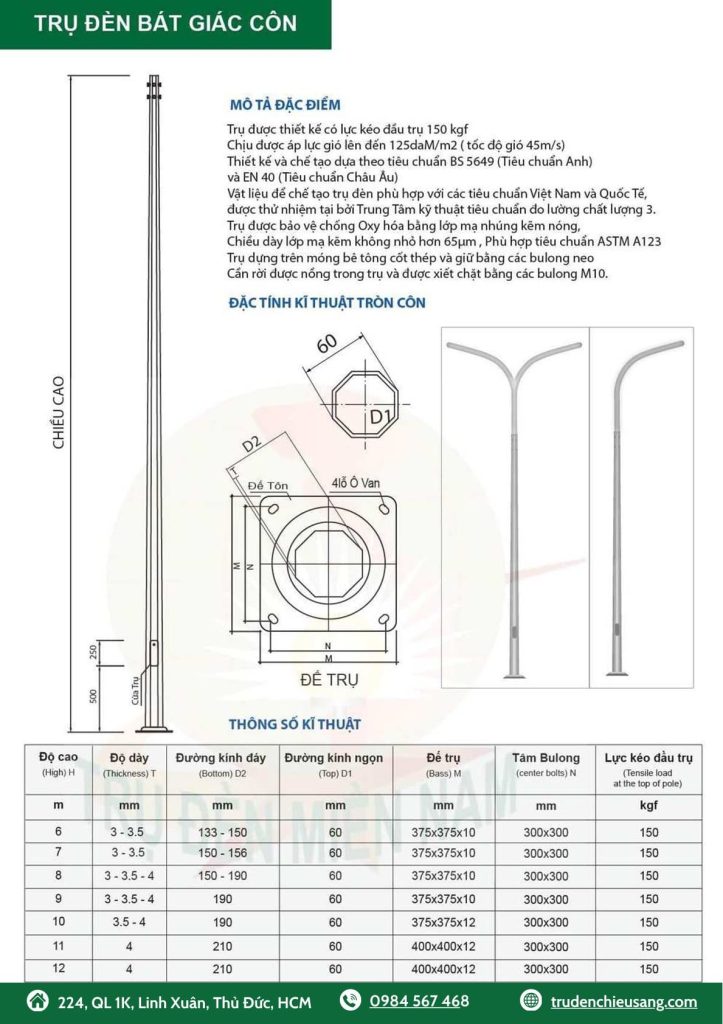 - Cột đèn chiếu sáng được tính toán thiết kế chịu được tốc độ gió đến 45 m/s (tương đương vùng áp lực gió 125 daN/m2).
